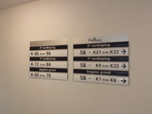 U kunt bij ons terecht voor alle soorten binnenbewegwijzering. We maken het allemaal snel en vakkundig in onze eigen fabriek. Maatwerk voor bedrijven en instellingen in uw eigen huisstijl. Afhankelijk van de toepassing kiezen we samen met u het juiste materiaal, de mogelijke afmetingen en de beste locatie in het gebouw. Professionele bewegwijzering door jarenlange kennis en ervaring. Daar kunt u van op aan!